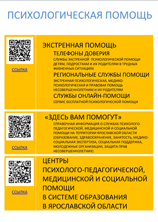 В связи с необходимостью оказания своевременной адресной психолого-педагогической, медицинской и социальной помощи обучающимся и их родителям, находящимся в трудных жизненных ситуациях, департамент образования Ярославской области представляет памятку с информацией о службах, оказывающих данную помощь. Памятка об оказании психологической помощи службами ЯО https://resurs-yar.ru/files/slujba/ps_help.pdf